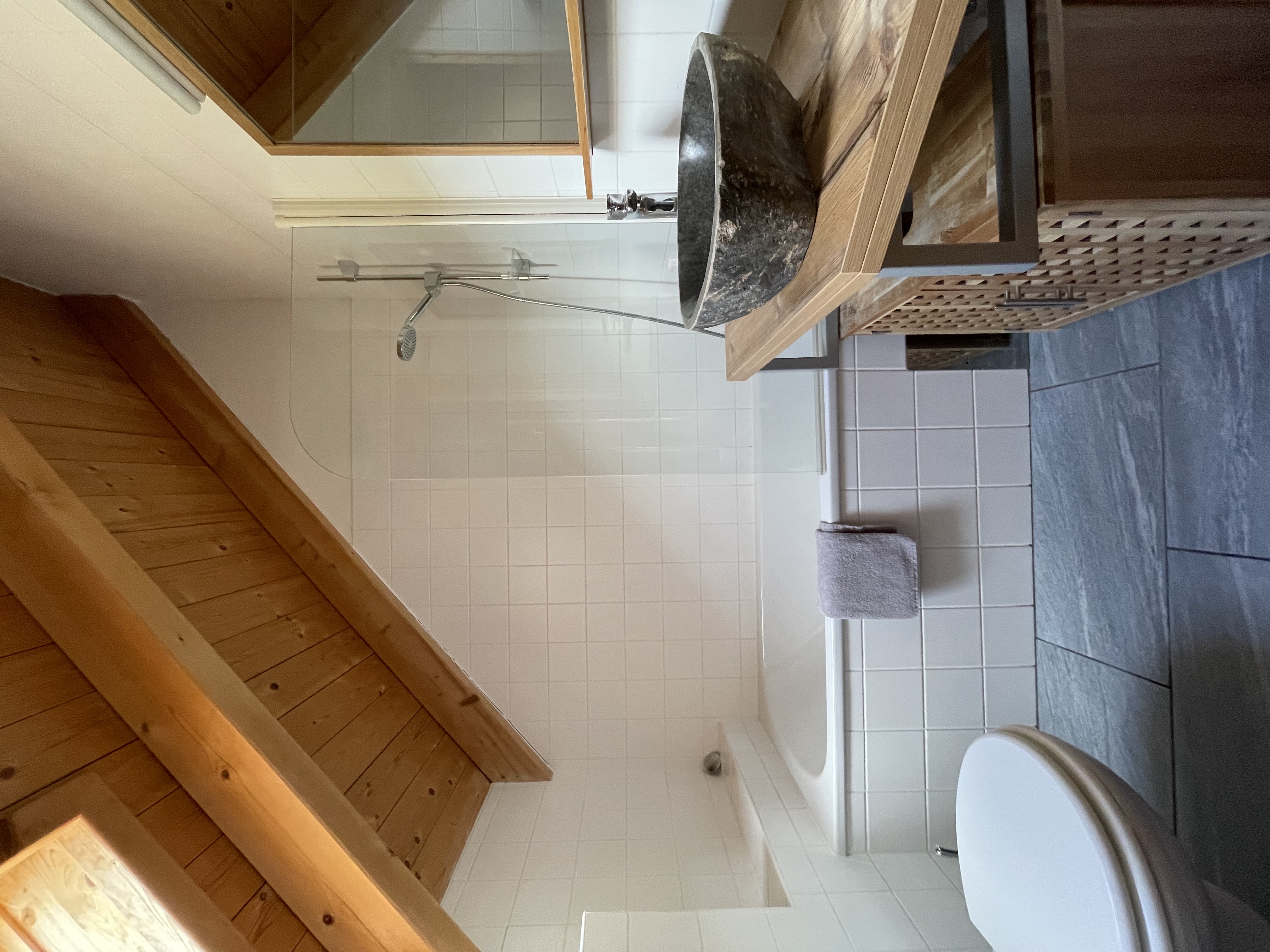Im Obergeschoss erwarten Sie zwei geräumige Schlafzimmer, eines mit Doppelbett und eines mit Ausziehdoppelbett und Stockbett. Damit ist das zweite Schlafzimmer für zwei bis vier Personen geeignet. Das Bad ist mit Wanne ausgestattet. Selbstverständlich befindet sich auch im Obergeschoss ein WC.